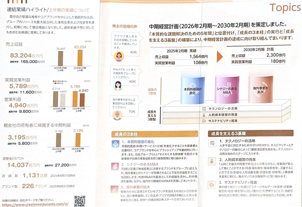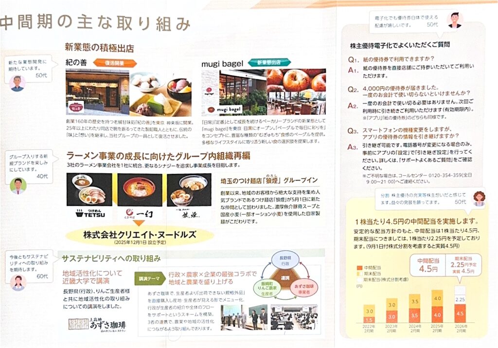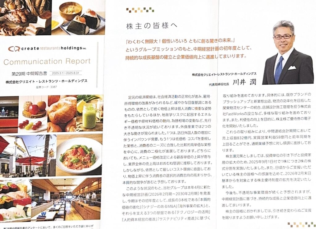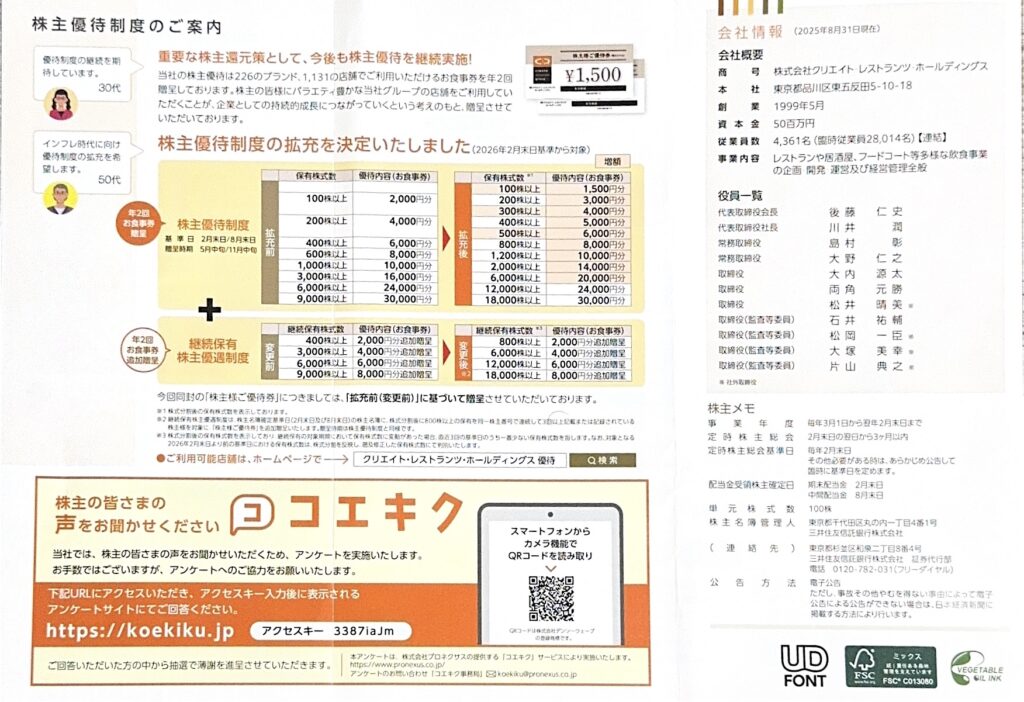 感想としては、同社は外食産業において多角的な事業展開を行っており、幅広い顧客ニーズに応えることができる企業として魅力的だと思います。また、同社が運営するレストランブランドは、日本の伝統的な料理を提供するブランドから、洋風のカフェスタイルのブランドまで幅広く、様々な世代の人々に愛されています。株主優待を利用することで、自分の好みに合ったブランドで食事を楽しむことができ、とても魅力的だと思います。