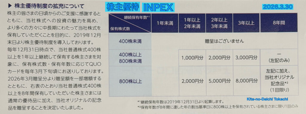 INPEXの公式サイトおよび株主案内より表(画像)を引用させていただきました。詳しい株主優待内容はINPEX(公式)サイトをご参照ください。