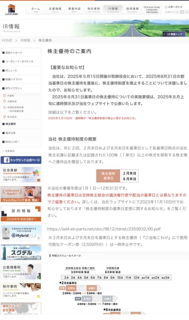 株式会社ラックランド(証券コード: 9612)は、2025年5月15日の取締役会において、2025年8月31日の割当基準日をもって株主優待制度を廃止することを決定しました。