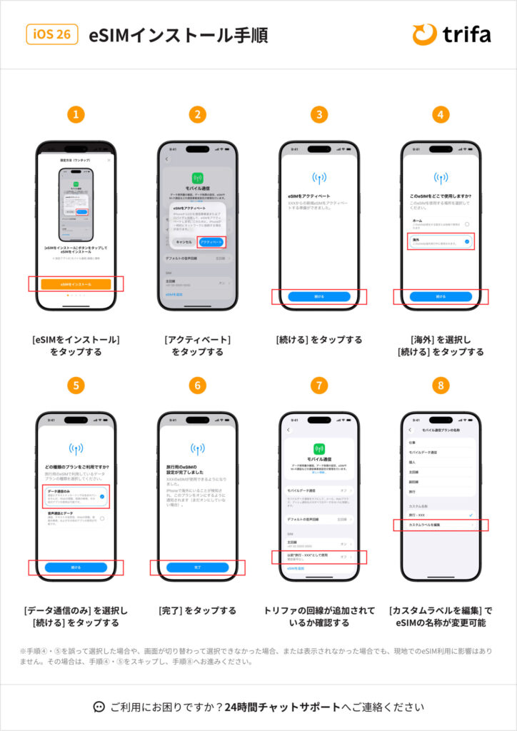 - eSIMのインストールには、安定したインターネット環境が必要です。Wi-Fi環境が整った場所で設定を行いましょう。