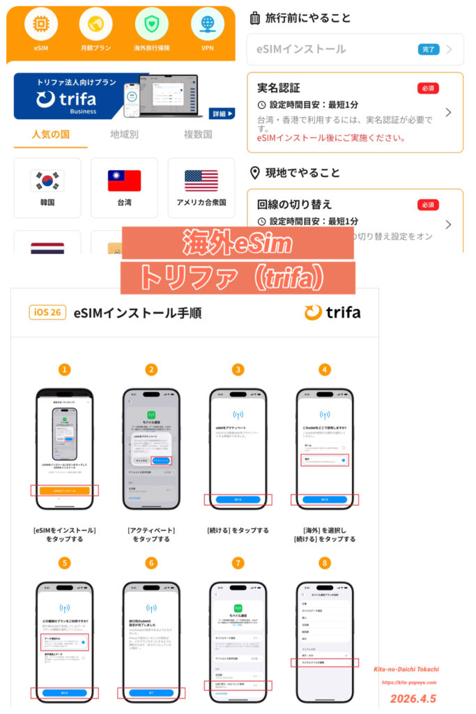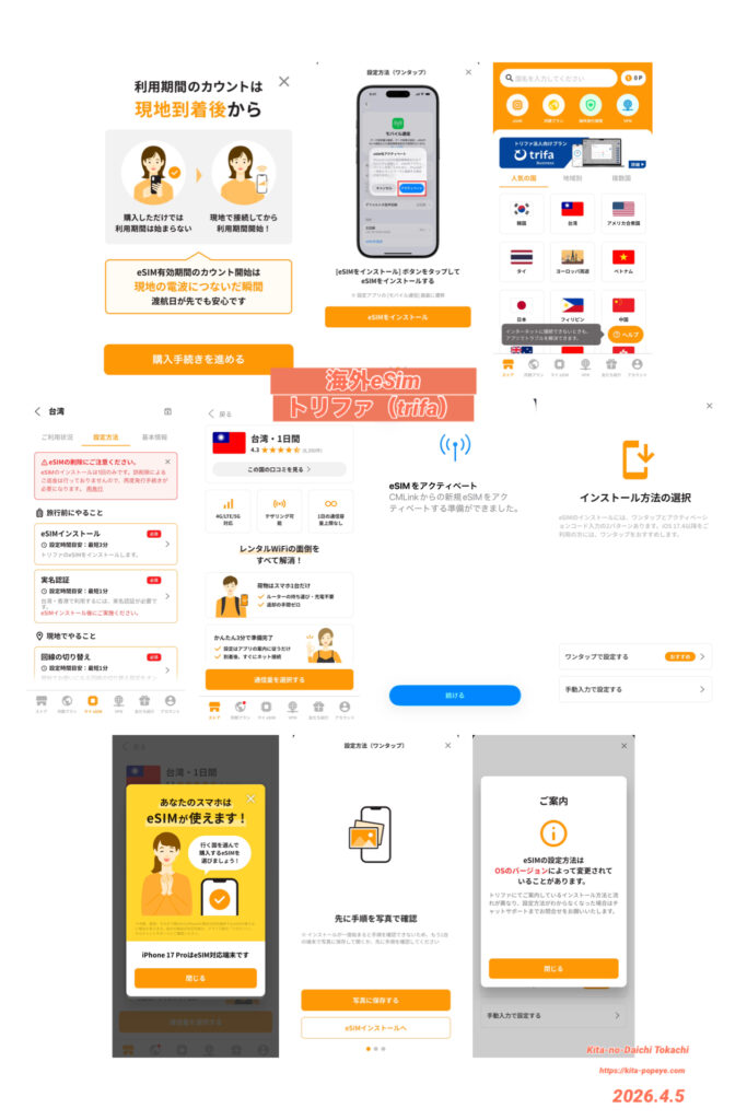トリファ(trifa)の海外eSIMは、アプリ経由で簡単に購入・設定でき、台湾プランでは実名認証(パスポート登録)もアプリ内で完了します。