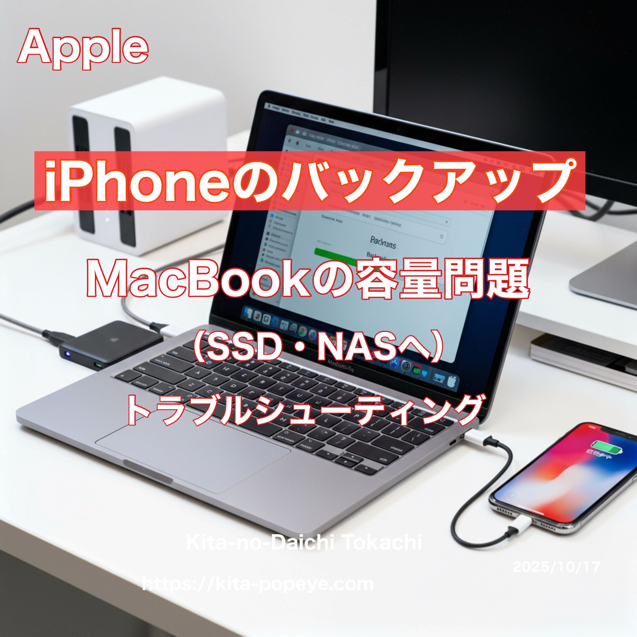 • Finder(Mac標準)でのiPhone全体バックアップは、基本的に内部ストレージか外付けUSBドライブが対応しやすく、NASに直接バックアップフォルダを置くのは仕様上難しい場合があります。