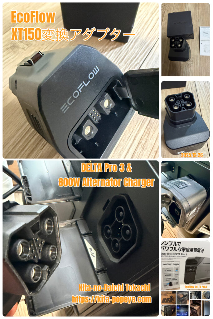EcoFlow800W Alternator Charger を DELTA Pro 3 と接続するには、専用の変換ケーブル(XT150変換アダプター)が必要です。DELTA Pro 3 は従来のXT60ポートではなく、XT150ポートを採用しているため、そのままでは接続できません。