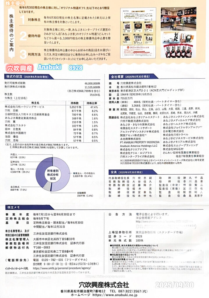 画像等あなぶき興産株式会社(穴吹興産)サイト及び株主優待案内書から引用させて頂いております。詳しくはあなぶき興産株式会社(穴吹興産)サイトをご参照してください。