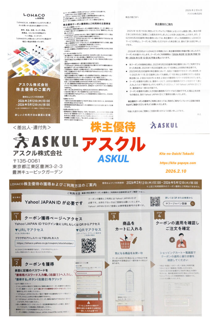 100株以上保有でLOHACO割引クーポン(500円分×4枚、計2,000円相当)が提供され、501円以上の商品1点ごとに使用可能です。11月20日基準で継続保有の場合、追加で同額分が送付されます。