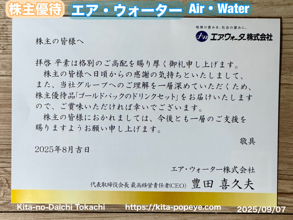 エア・ウォーターの株主優待は、自社グループ製品またはカタログギフトです。
