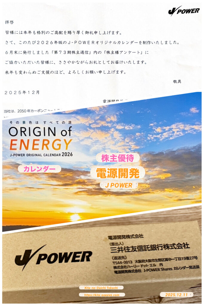 電源開発(J-POWER)(9513)の株主通信のアンケートでカレンダープレゼントが届く
