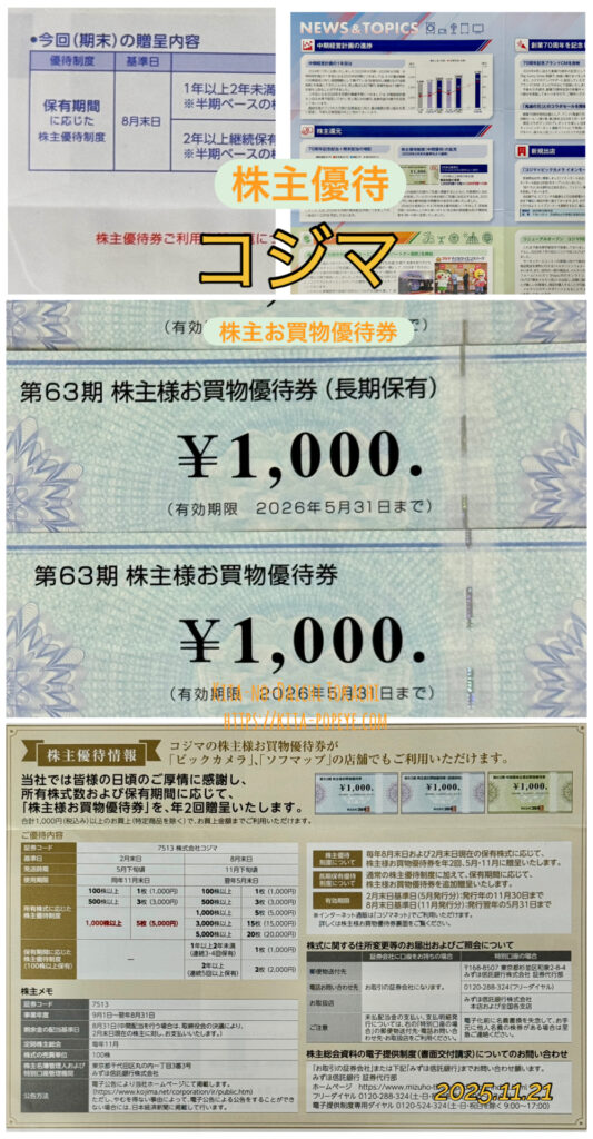 【コジマ】株主お買い物優待券1000円+1000円x2枚(長期保有)=3000円(2025.11.21郵便)