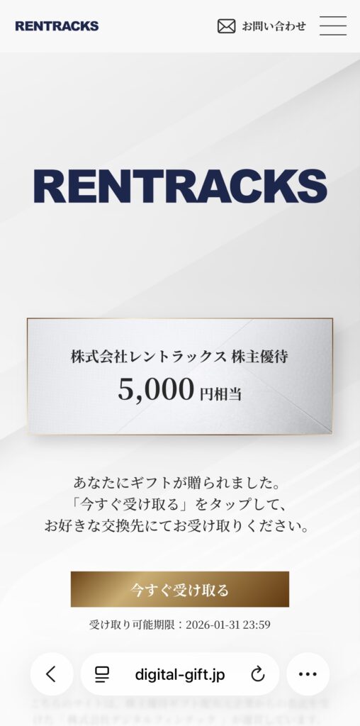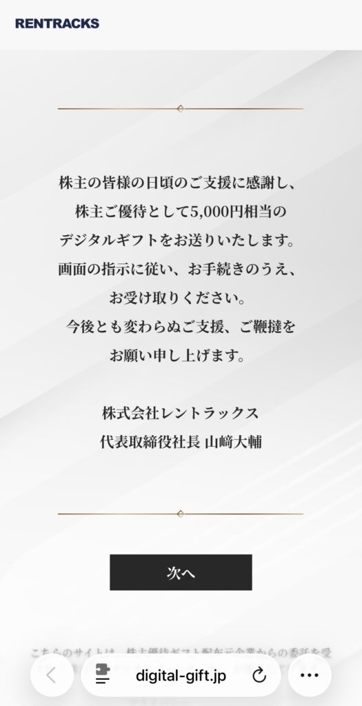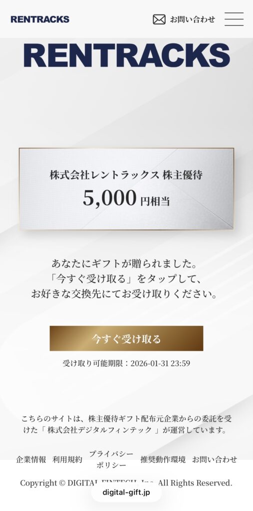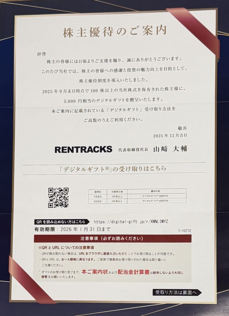 レントラックス(6045)の株主優待が届いた!デジタルギフト5,000円分の使い方レビュー