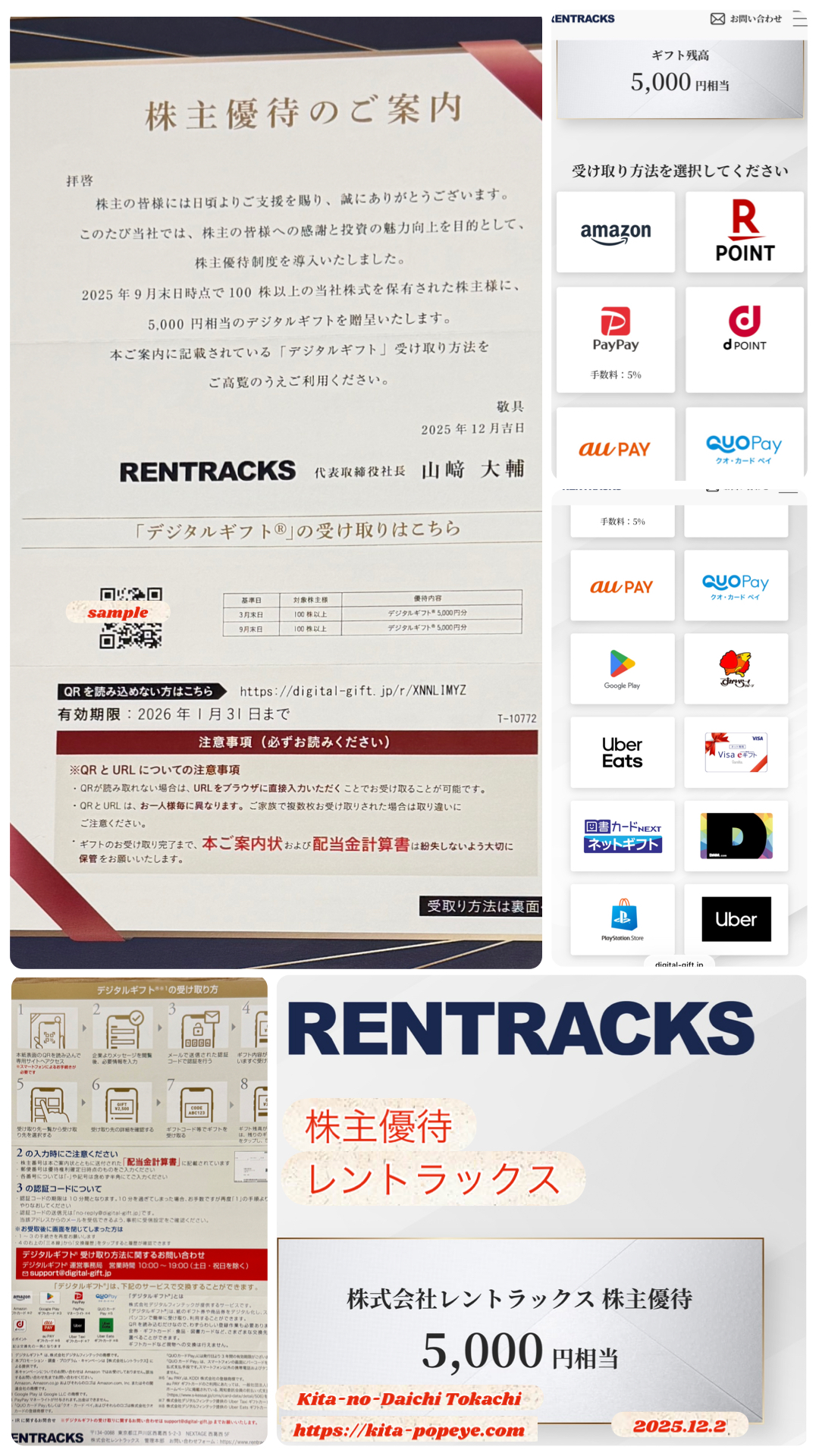 #株主優待 #RENTRACKS #レントラックス #デジタルギフト #Amazon #GooglePay #PayPay #QUOPay #dポイント #auPay #UberTaxi #UberEats