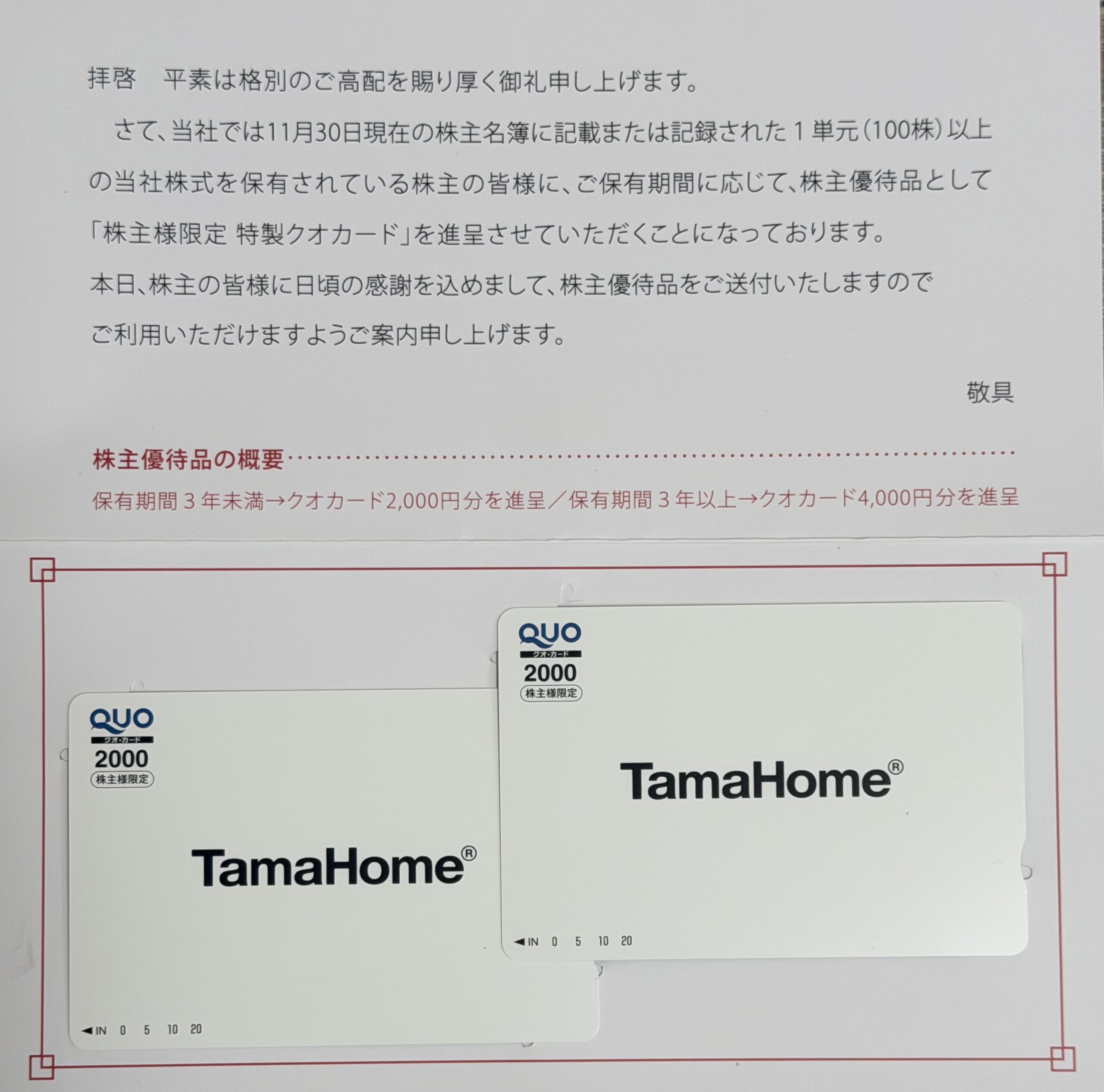 タマホームは、毎年5月末と11月末時点の株主を対象として株主優待を実施しており、「100株以上の株主に『QUOカード』500円分を年2回贈呈でした。(2025年まで)